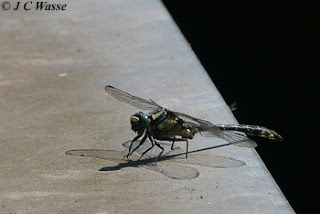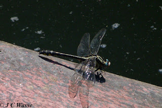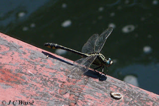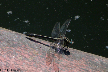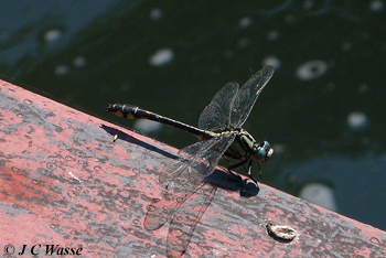 Common Club-tailed Dragonfly frequenting a weir along a canal near Blankenloch, Karlsruhe, Germany in June 2015.