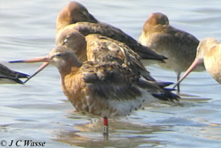 Up to 50 Black-tailed Godwits on Aveley Pools included 4 colour-ringed birds, 2 shown here (Birds 1 and 4).